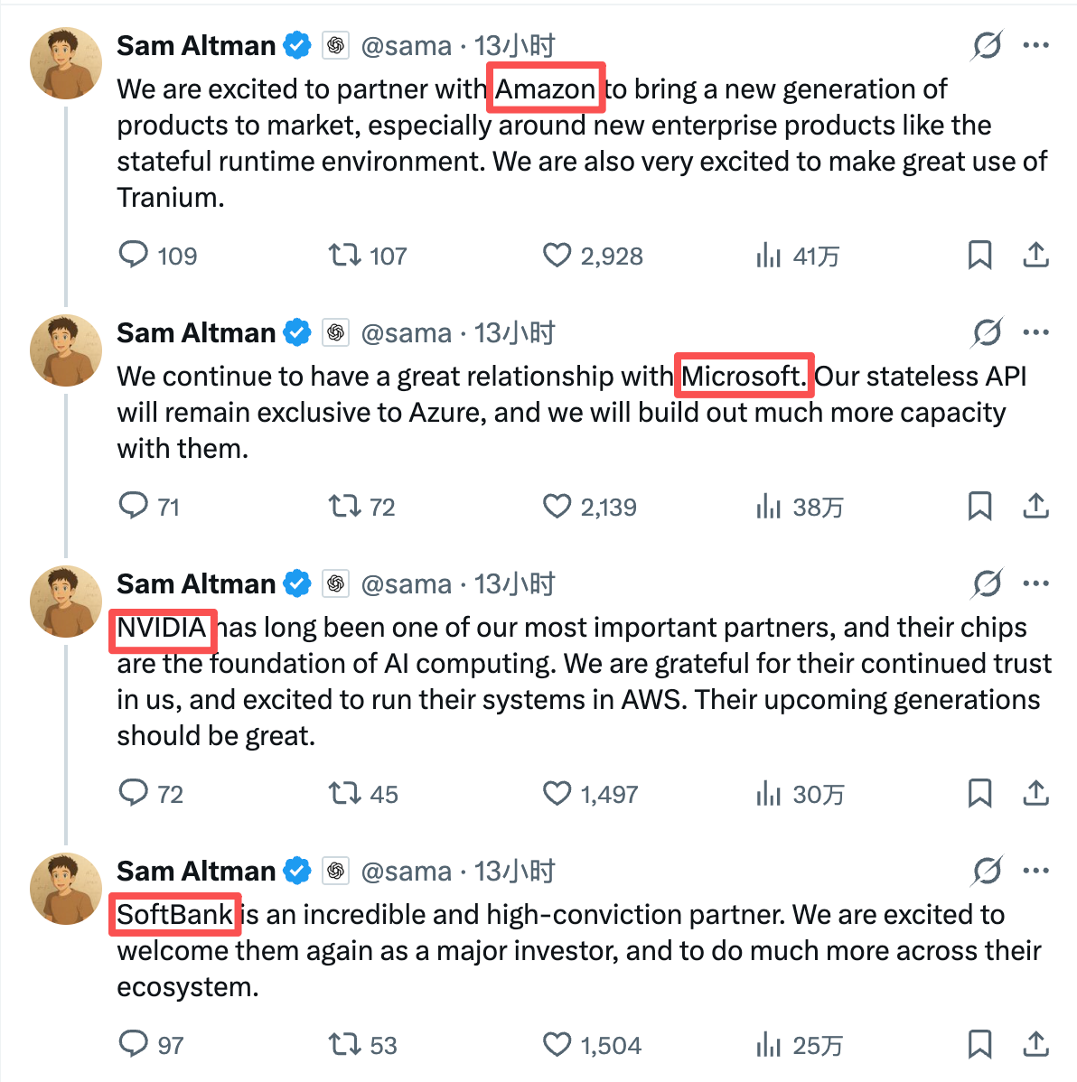 本轮融资的主要出资方包括三家行业巨头:亚马逊承诺投资500亿美元(首期150亿美元,后续资金将视条件逐步到位),英伟达以价值300亿美元的算力采购形式参与,软银集团同样出资300亿美元。融资完成后,OpenAI联合创始人萨姆·阿尔特曼在社交平台上公开致谢,其致谢顺序——亚马逊、微软、英伟达、软银——耐人寻味。未参与本轮投资的长期合作伙伴微软紧随亚马逊被提及,暗示了其不可动摇的地位。