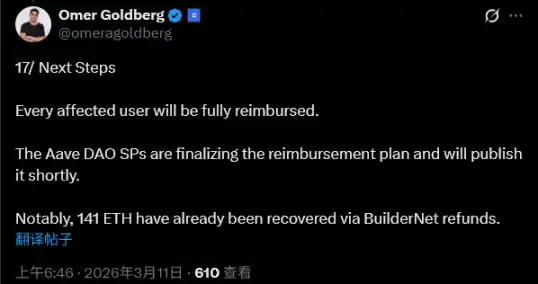 事件发生后,Aave的风险管理合作伙伴Chaos Labs迅速在社交平台X上作出回应。其首席执行官Omer Goldberg明确承诺:“未产生任何协议坏账,所有受影响的用户将获得全额赔偿。”Aave Labs创始人Stani Kulechov随后也发文确认:“Aave协议本身运行正常,未受影响。”