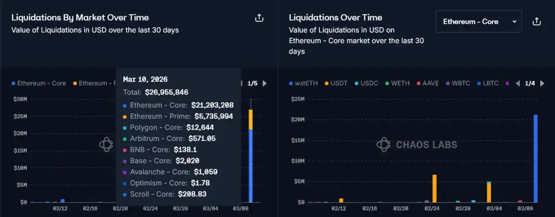 近日,头部去中心化借贷协议Aave经历了一场非典型的链上清算事件。在缺乏市场剧烈波动或外部攻击的情况下,约2700万美元的借贷头寸在短时间内被强制平仓,导致34个用户地址持有的近1.1万枚wstETH资产被清算机器人执行操作。