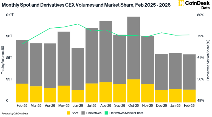 交易数据同样佐证了这一点:2月份中心化交易所总交易量降至5.61万亿美元,为2024年10月以来的最低水平。
