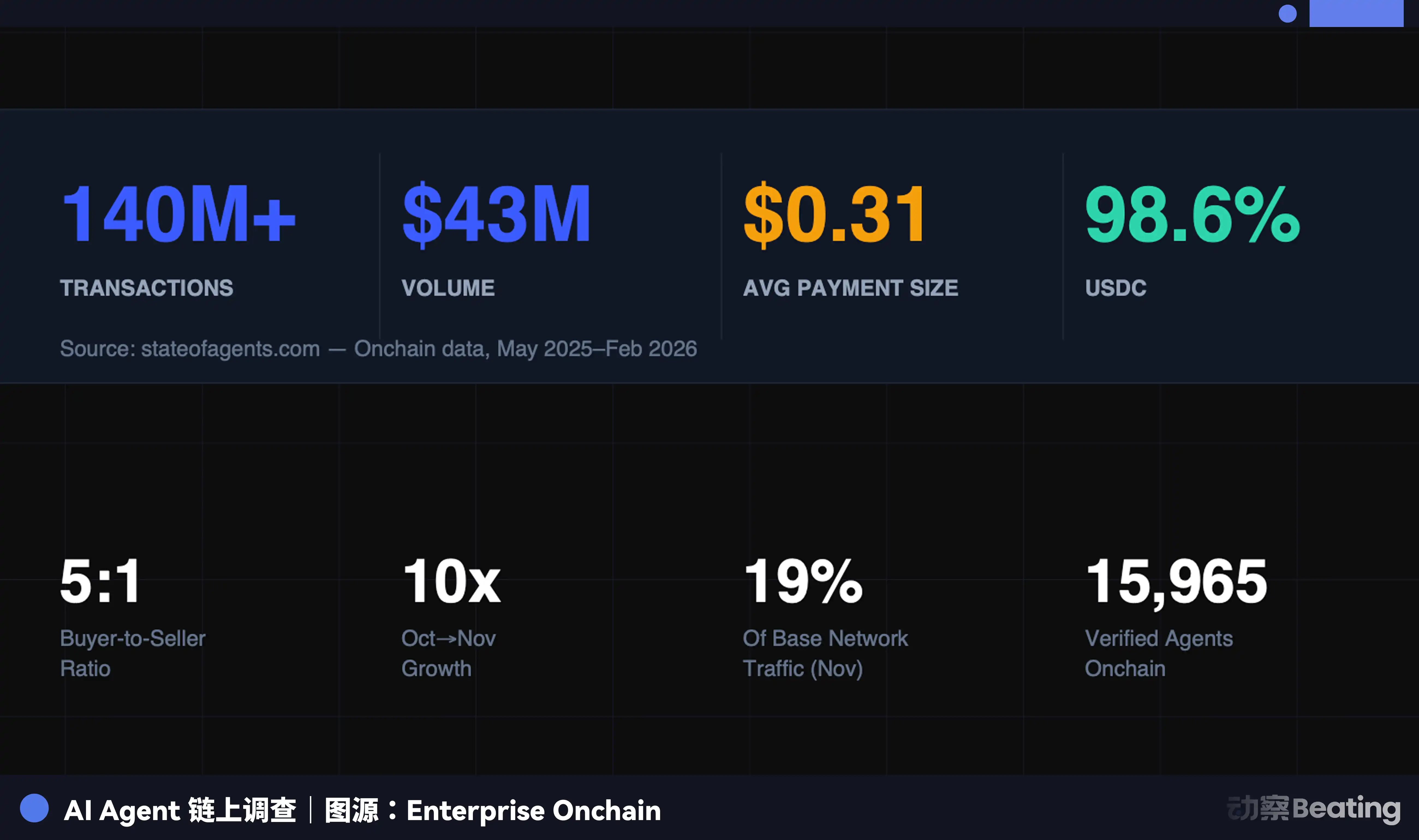 协议层竞争暂告段落,意味着决定性战场已转移。根据Enterprise Onchain的数据,过去9个月内,AI代理完成了1.4亿笔支付,总金额4300万美元,其中98.6%使用USDC稳定币,平均单笔交易额仅为0.31美元。具备支付能力的AI代理数量已超过40万个。