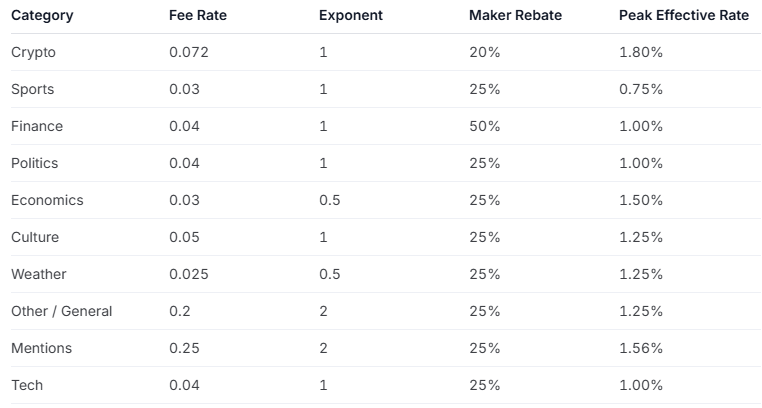 根据Polymarket发布的最新官方文档,平台将于2026年3月30日起实施新的手续费机制。此次调整大幅扩展了收费范围,在原有的加密货币和体育类别基础上,新增了金融、政治、经济、文化、天气等多个市场类别,这些类别下的交易将开始收取“吃单方”(Taker)手续费。