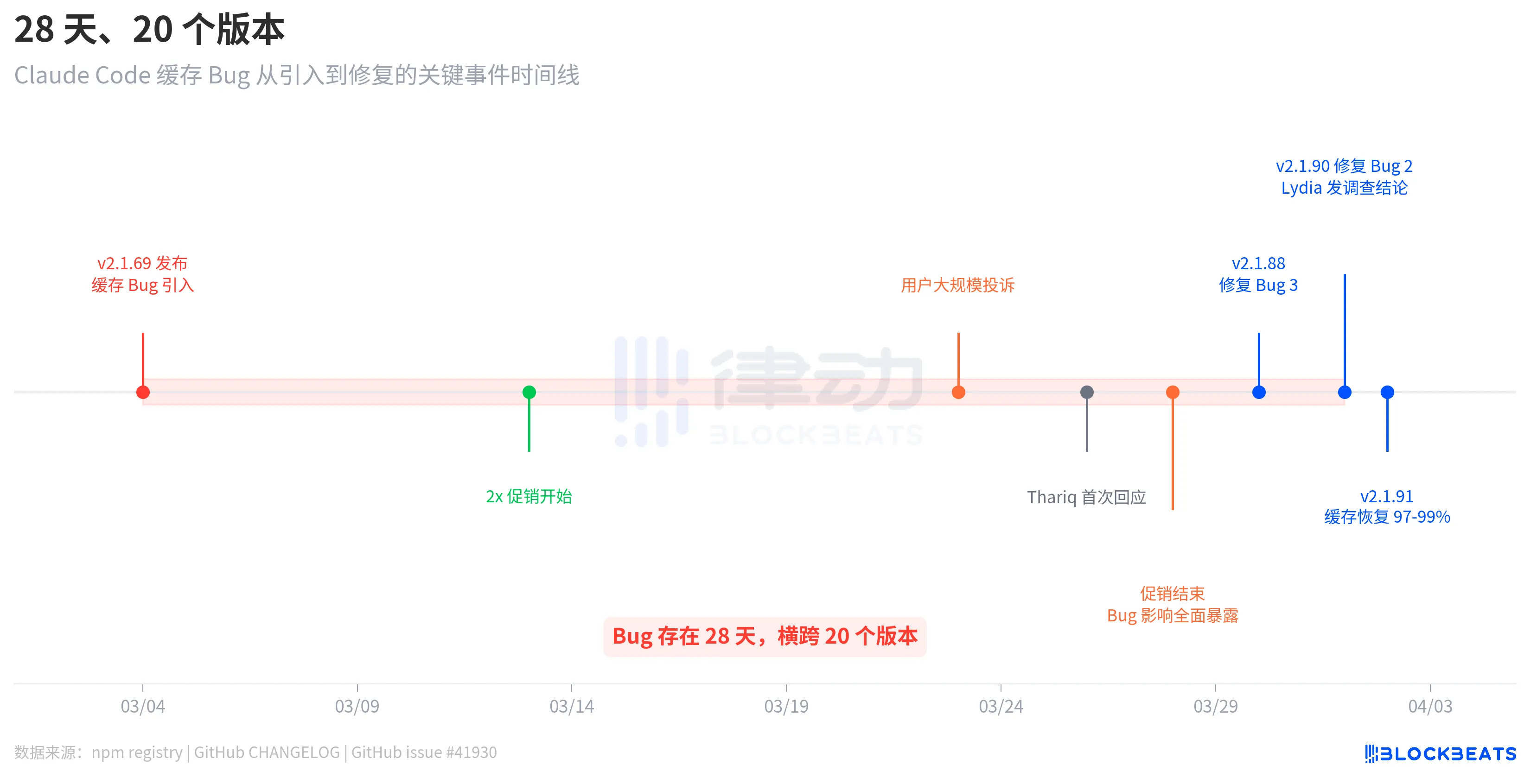 根据npm注册表的发布记录,该Bug最早出现在3月4日发布的v2.1.69版本中,直到4月1日的v2.1.90版本才被修复,持续时间长达28天,涉及20个中间版本。值得注意的是,在3月13日至28日期间,Anthropic推出了非高峰时段额度翻倍的促销活动,这在一定程度上掩盖了Bug的影响。促销结束后,用户额度消耗速度恢复正常基线,问题才集中爆发。