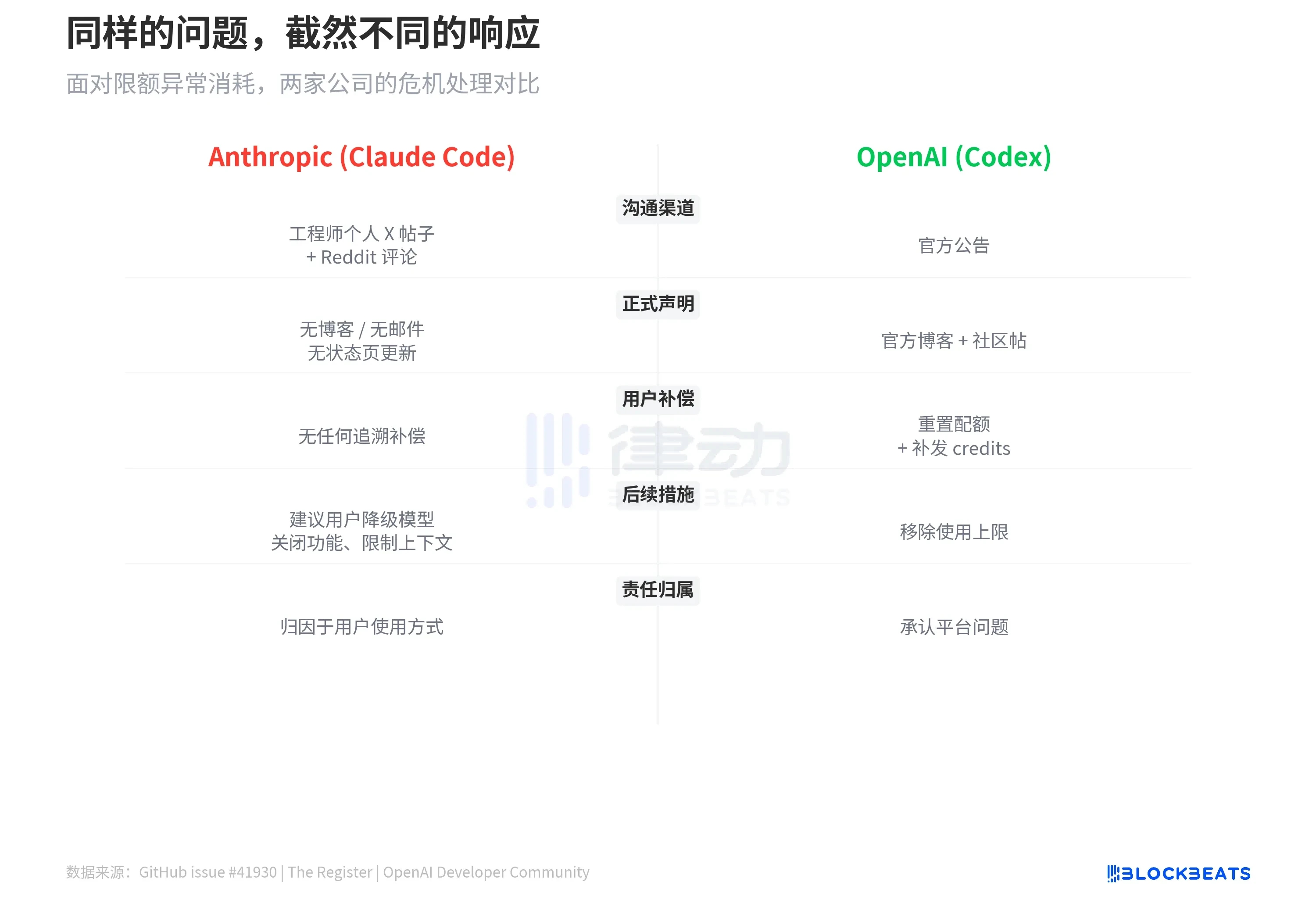 与此形成对比的是,OpenAI在旗下Codex产品出现类似额度异常消耗问题时,采取了为用户重置配额、补发积分,并最终移除使用上限的解决方式。