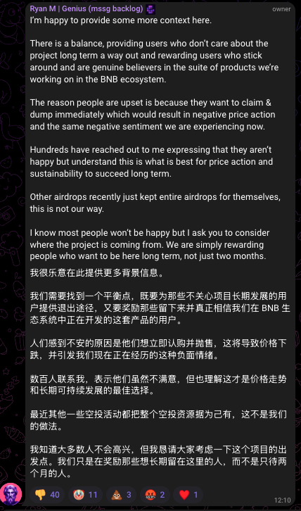 Genius团队对此规则的解释是,旨在区分短期投机者与长期共建者。一方面为无意长期参与的用户提供退出通道,另一方面则通过完整奖励来激励真正的生态信徒。官方甚至援引了CZ的一条推文来佐证其理念:“如果你曾羡慕那些能在市场周期中坚守并低价买入的人,请想想他们在关键时刻的抉择。”
