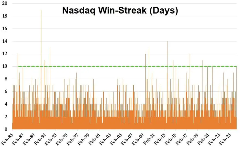 关键的市场指标印证了这一转向。自三月下旬以来,标准普尔500指数累计攀升接近10%,不仅收复了因地缘危机产生的全部跌幅,更显示出强劲的内生动力。以科技股为核心的纳斯达克100指数同期涨幅约12%,并且实现了连续十个交易日的上涨,创下2021年以来的最长连涨纪录。