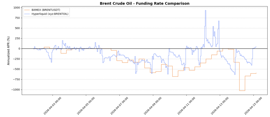 这是当前市场中最引人注目的机会之一。策略涉及在两个不同平台对同一标的(布伦特原油)建立方向相反的头寸:在BitMEX做多BRENTUSDT永续合约,同时在Hyperliquid做空Brent永续合约。