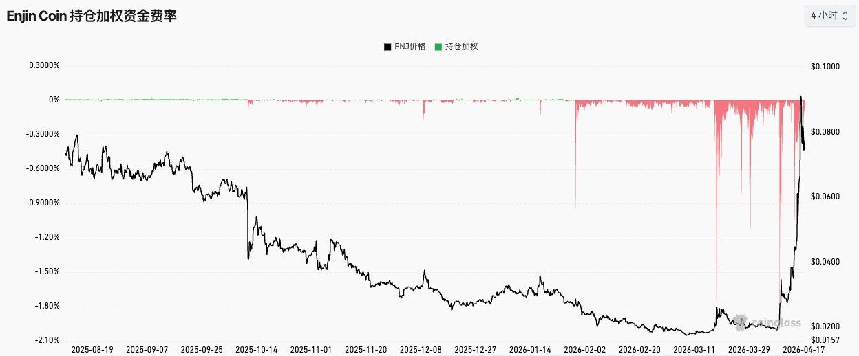 “币安人生”在上线交易所经历深度回调后,于4月中旬突然启动第二轮拉升,价格短时间内翻越数倍。而ENJ则呈现典型的超跌后垂直拉升形态,期货端极度拥挤的空头仓位在价格突破关键阻力后被迫回补,形成了加速上涨的级联效应。