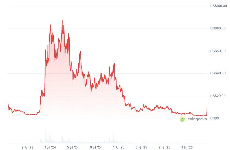 回顾其长期走势,ORDI自2025年初从28-30美元区间开启下行通道,历经超过一年的单边下跌,于2026年3月触及2-3美元的历史底部区域,相较峰值回撤幅度超过98%。此次巨量阳线拉升,在技术形态上构成了超跌后的暴力反弹。