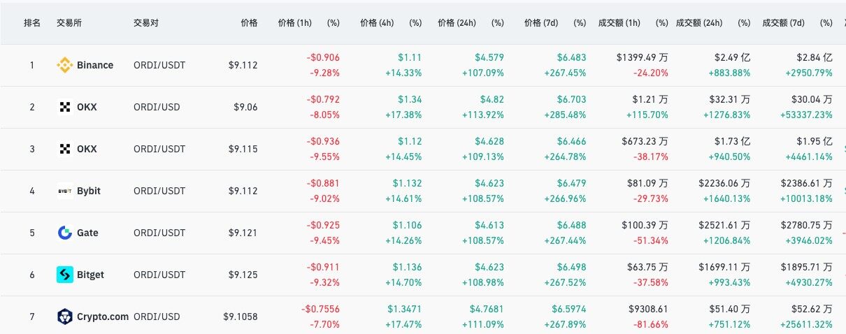2026年4月16日,加密货币市场见证了一场典型的“脉冲式”行情。作为BRC-20代币的代表,ORDI价格从3.4美元附近骤然启动,盘中最高触及9.68美元,单日最大涨幅一度突破190%。伴随价格飙升的是交易量的急剧放大,其中仅币安现货平台的24小时成交额就高达2.49亿美元。