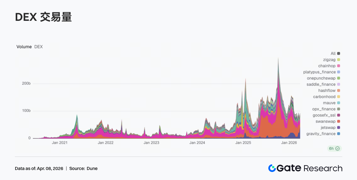 去中心化交易所的竞争格局上周发生显著变化。基于Solana的Meteora协议交易量激增,跃居首位,其采用的动态流动性管理机制在高波动环境中展现出优势。而一些主流DEX的交易量则出现回落。这一变化表明,流动性正加速向能够提供更高资本效率与更优交易体验的协议集中,Solana生态内部也出现了明显的资金再分配。