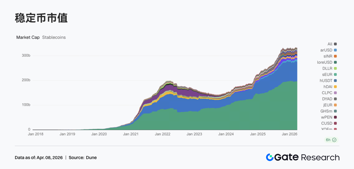 链上稳定币总供应量维持在高位平台震荡。USDT规模基本持平,USDC出现小幅回落。值得注意的是,资金增量明显流向DAI、USDS等DeFi原生稳定币,反映出资金更倾向于留在DeFi生态内进行生息或提供流动性,而非单纯持有。