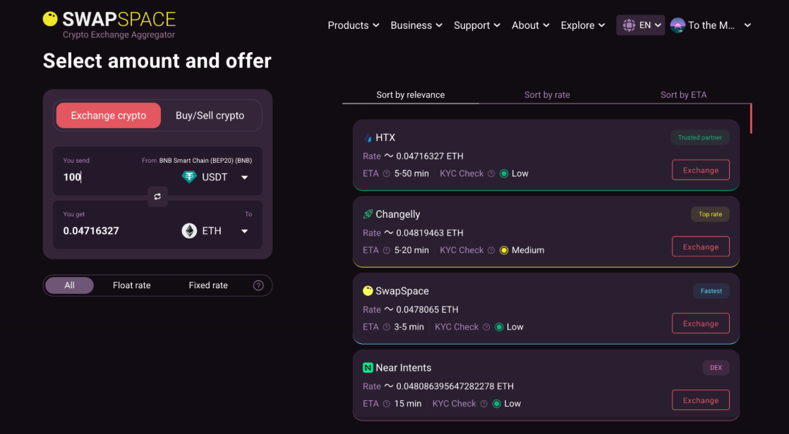SwapSpace成立于2019年,是一家领先的加密货币交易聚合平台。它与超过40家可信赖的合作伙伴携手,为用户提供快速、低成本的资产兑换服务。其核心机制在于聚合全球主流交易平台的报价,并依据价格、KYC要求、预计到账时间等关键条件进行智能排序,使用户能够节省比价时间,且无需支付任何额外聚合手续费。