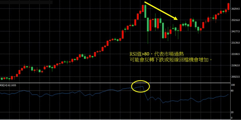 RSI值>80,代表市场过热,市场上已经交投热络,可能会反转走下跌趋势,或短线回档机会增加。