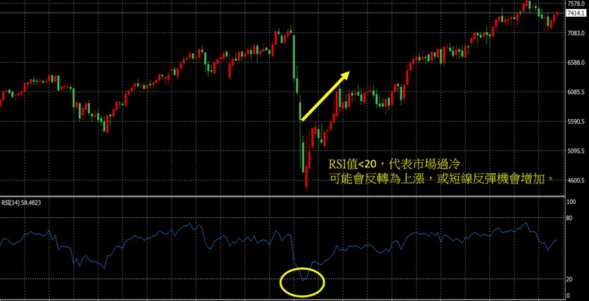 RSI值<20,代表市场过冷,股价或许已跌到谷底且交投低迷,可能会反转为上涨趋势,或短线反弹机会增加。