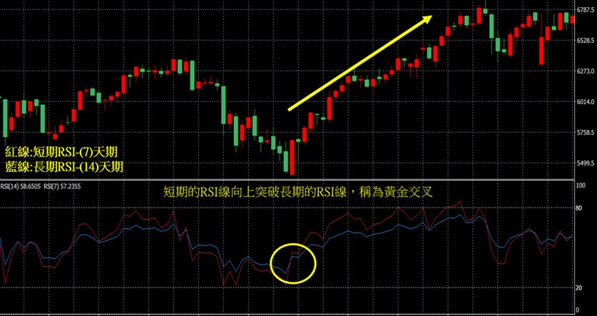 RSI指标的另一个判断买进或卖出讯号的方式,当短期的RSI线向上突破长期的RSI线,两线的交点称为黄金交叉,表示短期上涨趋势强度大于长期是买进讯号。