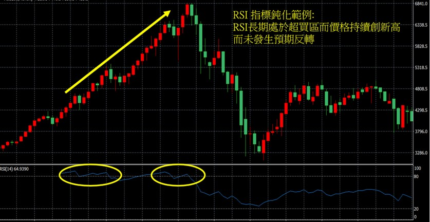 「钝化」指的是指标失去作用的现象发生。 RSI 对于价格涨跌的反应非常敏感,因此当价格在一个长期趋势时(连续上涨或是连续下跌)。