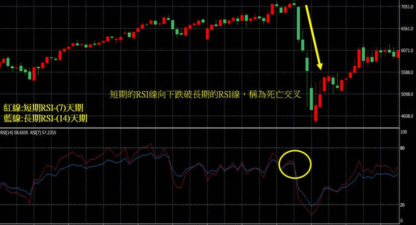反之,当短期的RSI线向下跌破长期的RSI线,称为死亡交叉,表示短期内下跌的趋势强度大于长期为卖出讯号。