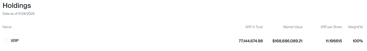 截至11月24日,该基金持有77,144,674枚XRP(7714万枚),作为向投资者发行的股份的支撑。按当前市场价格计算,这些持仓价值1.6868亿美元。