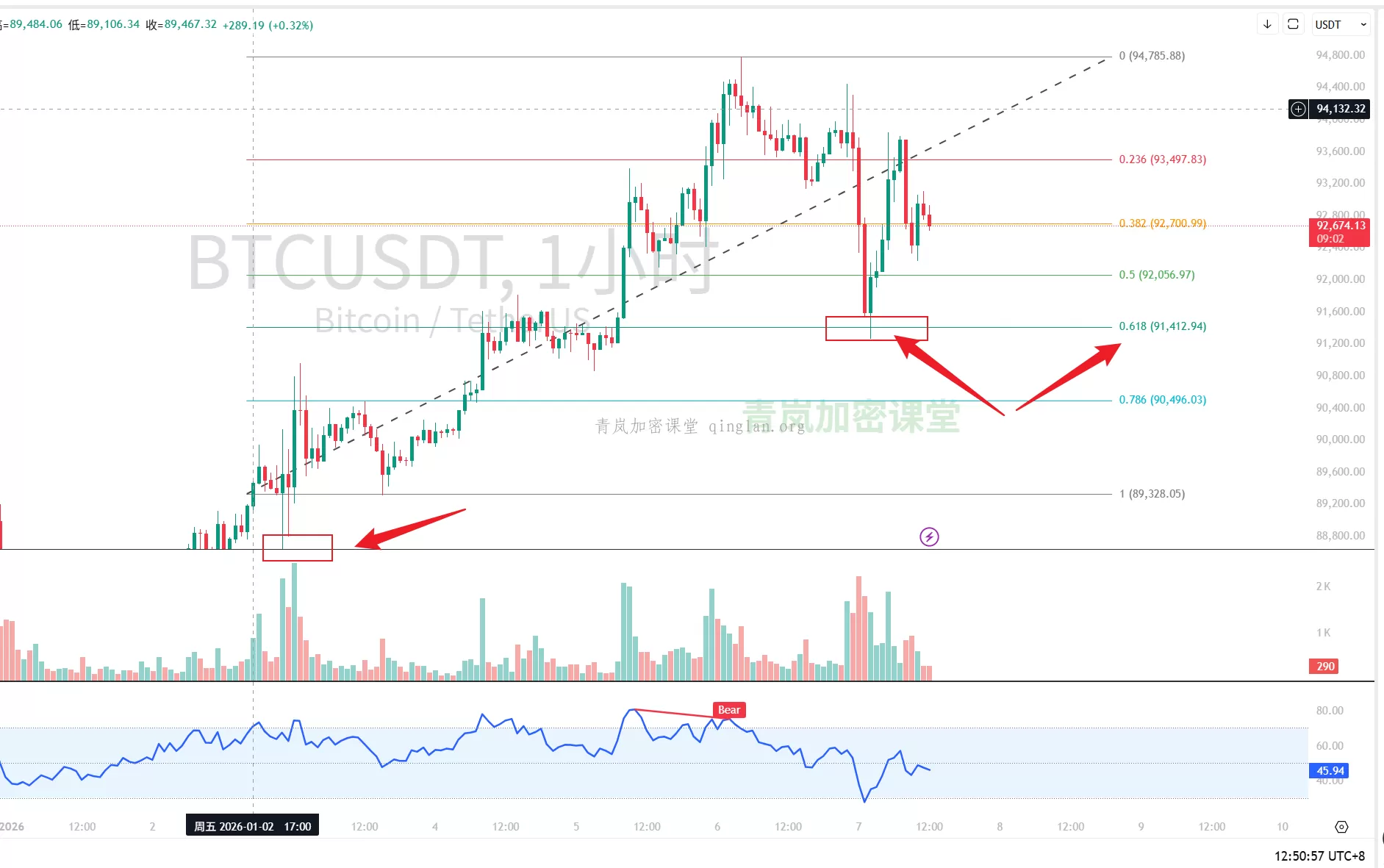 这是画线的基础,不能乱画。你得在比特币的K线图上,找到一段你认为明确、有力的上涨波段。比如,从2025年10月的低点25000美元附近,一路涨到2026年1月的高点48000美元这段([市场行情数据/2026年1月])。起点是低点,终点是高点。