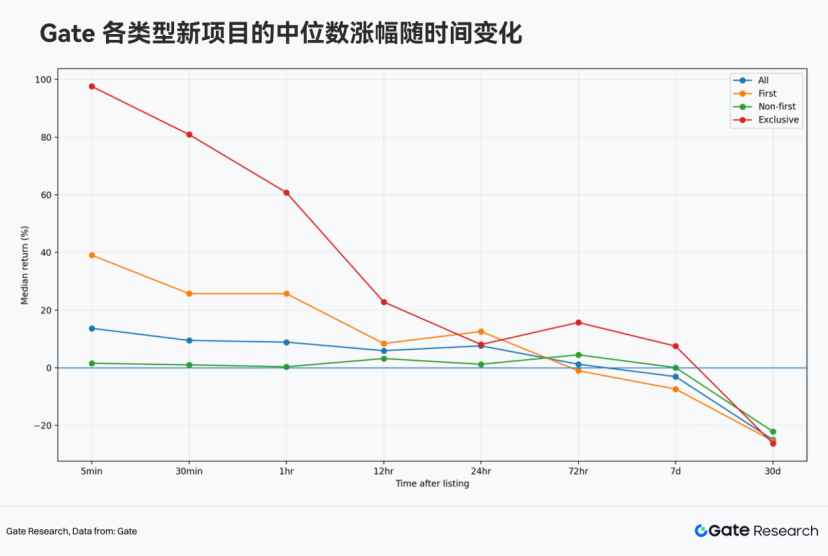 - 在上市后5分钟至24小时的关键价格发现窗口,首发及独家项目在涨幅中位数和上涨概率上均显著优于非首发项目,表明Gate具备将市场关注高效转化为早期财富效应的能力。